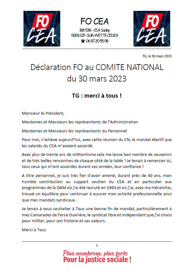 Au nom de l'ensemble du Bureau FO CEA CESTA,
